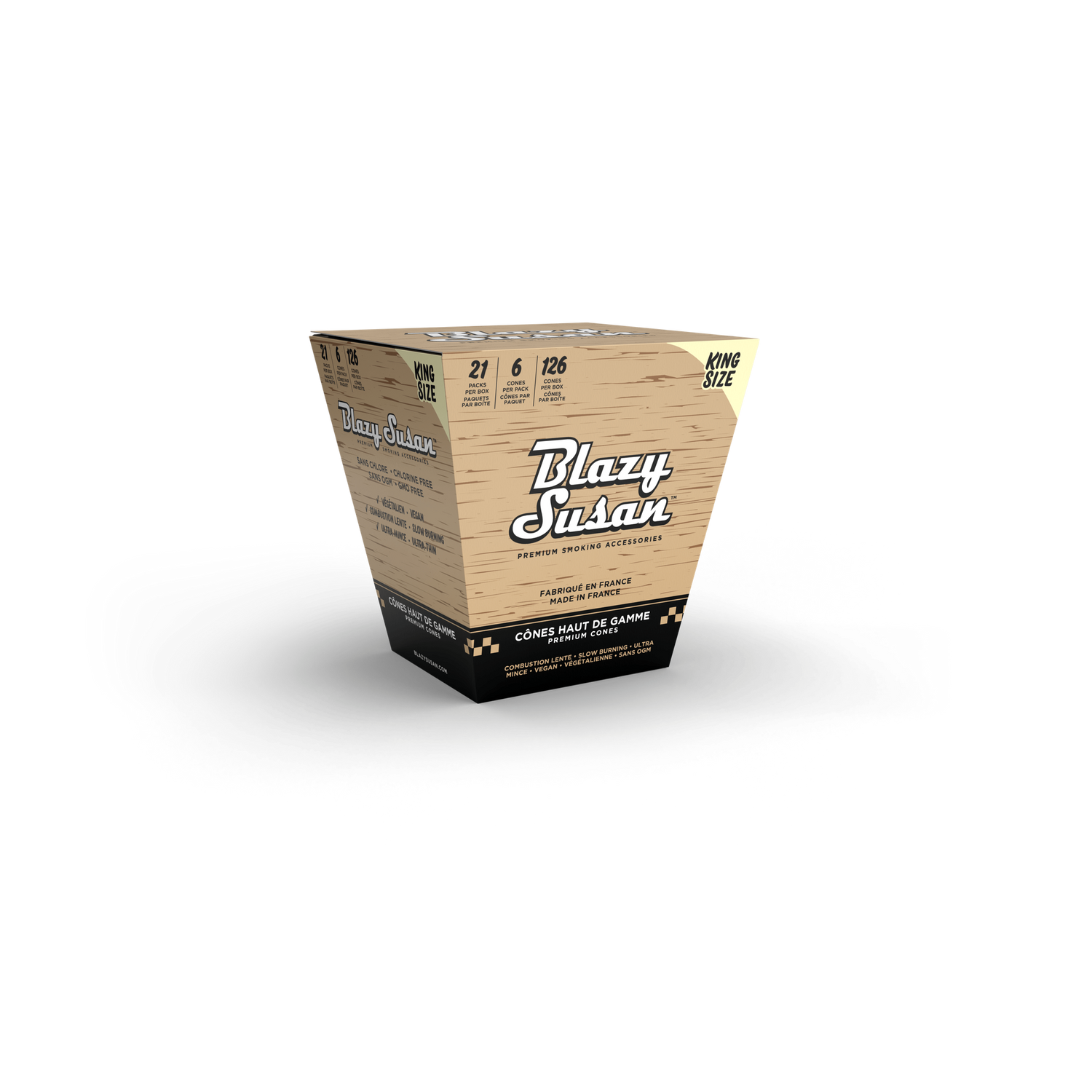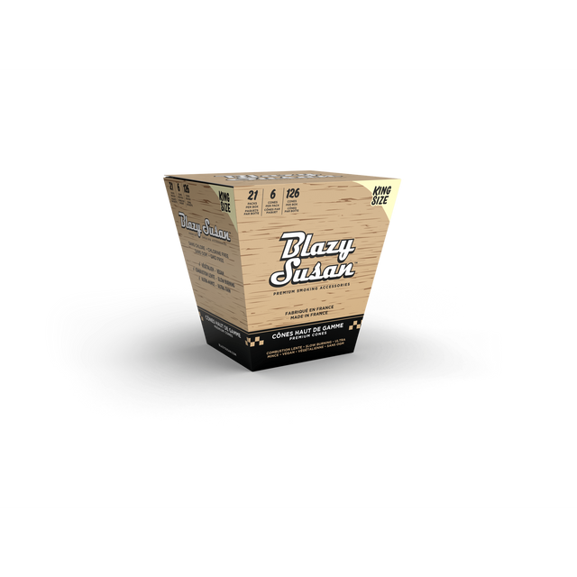 The Blazy Susan Full Box King Size Cones includes 63 pre-rolled cones (21 packs × 3 cones per pack). Each cone is king-size and made from ultra-thin French paper that is vegan, non-GMO, and chlorine-free.