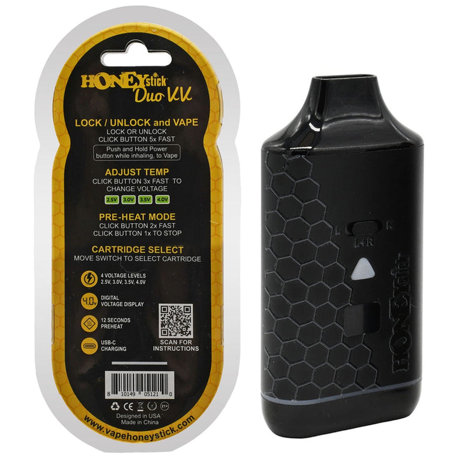 Say goodbye to frequent recharges and hello to extended vaping sessions. The HoneyStick DUO VV is equipped with a robust USB-C rechargeable 650mAh 510 vape battery, delivering enough power to keep up with even the most dedicated vapers.
